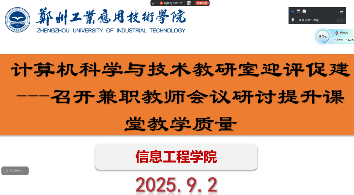 (文/郭玉洁 图/王书敏)为积极推进迎评促建,切实提升课堂教学质量。2025年9月2日19点,计算机科学与技术教研室组织召开兼职教师线上专项会议,会议以“迎评促建、提升课堂教学质量”为核心,聚焦本学期教学工作重点。会议由教研室主任冯梦清主持,计算机科学与技术教研室全体兼职教师参加。
