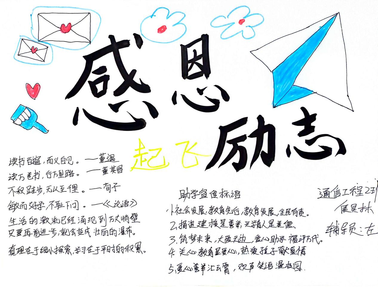 让员工学会感恩,珍惜身边的人和事,以及他们的生活。这种教育不仅有助于培养员工的感恩之心,还能增强班级的凝聚力和员工的社会责任感。本次活动 ,各班积极响应,采用各种活动形式,有针对性地开展本次感恩励志宣传教育。其中多个班级制作了手抄报,手抄报是感恩文化建设的一个窗口,针对性强,重点突出。手抄报可以通过简洁的文字和鲜明的图画表达通俗易懂的内容,带给大家警示的作用,培养和增强员工的感恩意识。员工在制作手抄报的过程中,让员工理解父母、老师、同学对自己的爱,让员工学会理解、报答父母、老师、同学,以实际的行动回报他们。