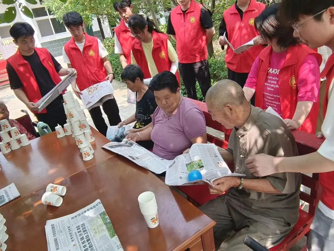 随后,团队成员邀请老人们一起参与了报纸传球、杯子叠叠乐、纸杯山等丰富的趣味互动游戏。在游戏中,老人们和团队成员互相配合,默契十足。趣味游戏不仅丰富了老年人的闲暇生活,还能起到运动锻炼的作用,增强老人的体质。