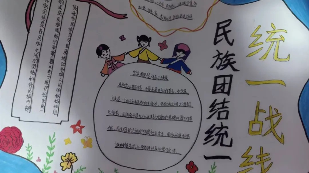 在本次主题团日活动中,同学们都深刻认识到民族团结统一的重大意义,并制作了相关手抄报,在手抄报中表达了各民族间的文化隔阂逐渐消融的想法,为民族团结统一筑牢深厚的情感根基。