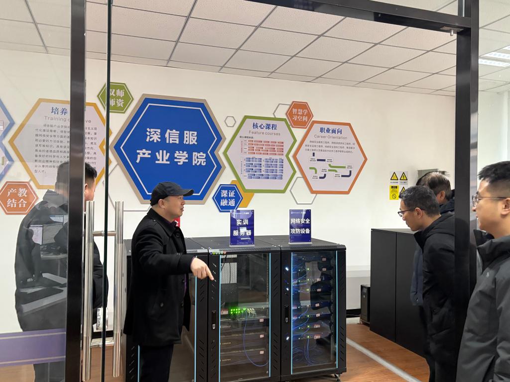 访问团参观了电子创新实验室、5G网络实验室、网络安全实验室等4个产教融合实验室,杨鑫磊介绍了公司在产教融合方面的进展和成果,重点就深信服产业公司及网络安全实验室进行了参观,介绍了深信服冠名班日常教学、实训实践、网络攻防演练、实习就业等相关内容,详细讲解了网络安全实验室内服务器的功能及作用。